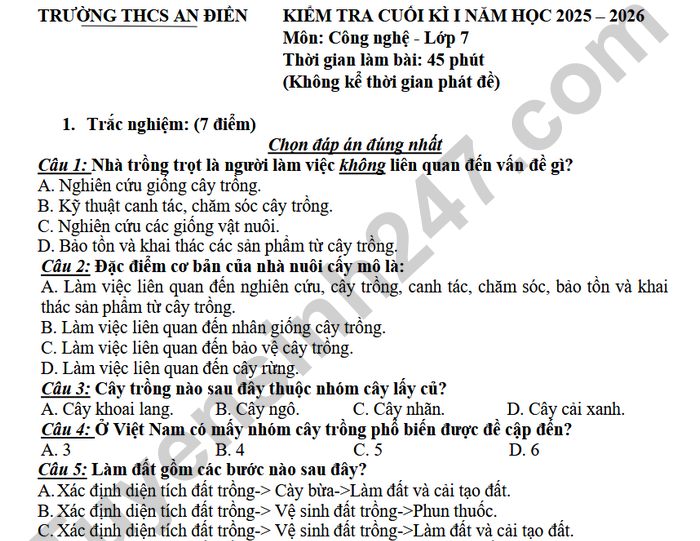 Đề thi cuối kì 1 Công nghệ lớp 7 THCS An Điền 2025 Câu 14: Rừng được phân loại theo mục đích sử dụng gồm mấy loại? A. 2 loại: Rừng sản xuất; rừng tự nhiên. B. 3 loại: Rừng sản xuất; rừng đặc dụng; rừng phòng hộ. C. 2 loại: Rừng sản xuất; rừng phòng hộ. D. 4 loại: Rừng sản xuất; rừng đặc dụng; rừng phòng hộ; rừng ngập nước. Câu 15: Ở các tỉnh miền Trung và miền Nam nước ta, thời vụ trồng rừng chính là: