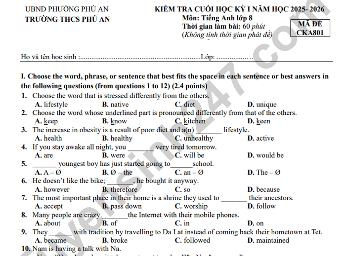 Đề thi cuối kì 1 môn Anh lớp 8 THCS Phú An 2025 IV. Read the following passage. Decide if the statements 20 and 21 are True or False. Choose the correct answer for questions from 22 to 24. (1.25 points) We all live in a society and are all bound to a neighbourhood. Neighbourhood is very important and it does definitely have an impact on what we are and how and where we live in. I live in a great and wonderful neighborhood. It is very pleasant and has many facilities. With a good park nearby, making it the main attraction, our neighborhood also has many other added bonuses. The grocery store is nearby which makes it easy for all residents to make an immediate purchase, we have a bus stop close by, so that people do not have to travel long for means of transportation. The park is what makes it a lot more beautiful as it is well maintained and makes it a gathering place for all my neighbors in the evening for chit-chatting and playing for kids. There is good air and we enjoy the evenings while we are at this park.