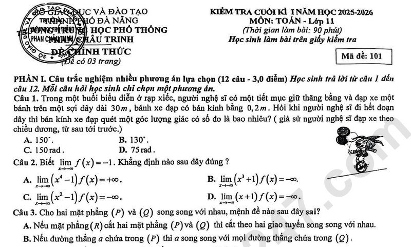 Đề thi cuối kì 1 môn Toán lớp 11 THPT Phan Châu Trinh 2025 Câu 2. (0,5 điểm) Một bệnh nhân hàng ngày phải uống một viên thuốc 81 mg. Sau ngày đầu, trước mỗi lần uống, hàm lượng thuốc cũ trong cơ thể vẫn còn 5%. a/ Tính lượng thuốc có trong cơ thể sau khi uống viên thuốc ngày thứ 3 (làm tròn kết quả đến hàng phần trăm của đơn vị mg). b/ Ước tính lượng thuốc trong cơ thể nếu bệnh nhân sử dụng thuốc trong một thời gian rất dài (làm tròn kết quả đến hàng phần trăm của đơn vị mg).