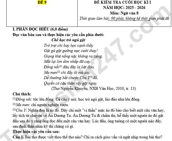 Đề thi cuối kì 1 năm 2025 lớp 8 môn Văn Dễ thường bắt chước Chu Y3 đó, Quyển có câu thần vậy gật ngay. (Thơ Nguyễn Khuyến, NXB Văn Học, 2010, tr. 13) (1)Đồng nổi: tức lên đồng. Cả câu ý nói: học trò ngủ gật, lảo đảo như lên đồng. (2)Ma men: chỉ người nghiện rượu. (3)Chu Y: Nghĩa đen là áo đỏ. Đây chỉ một “vị thần” mặc áo đỏ báo cho biết một câu văn hay, lấy tích từ chuyện về Âu Dương Tu. Âu Dương Tu đi chấm thi, hễ thấy một người áo đỏ gật đầu sau đó y rằng ông đọc đến một câu văn hay. Lúc đầu, ông tưởng có một người nào đấy, sau định thần nhìn kỹ thì chẳng có gì.