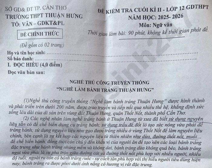 Đề thi cuối kì 2 lớp 12 môn Văn 2026 - THPT Thuận Hưng