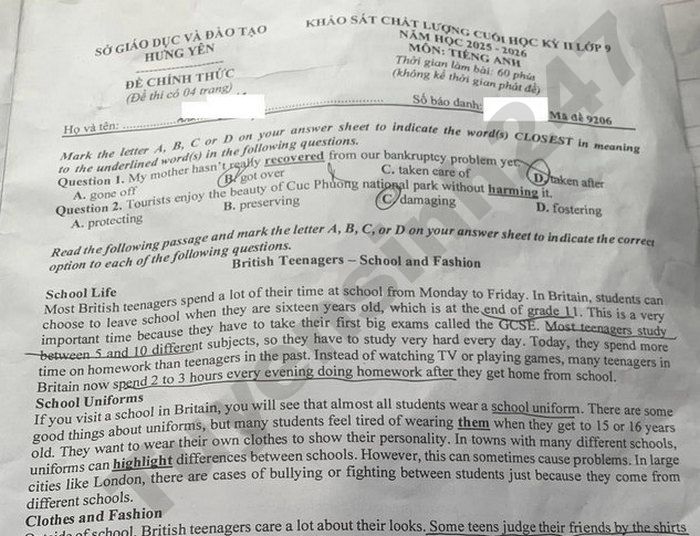 Đề thi cuối kì 2 lớp 9 môn Anh 2026 - Sở GD Hưng Yên Question 35. "I'm so tired. I don't want to go out" she said. A. She said that she was so tired and didn't want to go out. B. She said that she is so tired and didn't want to go out. C. She told us to be so tired and not want to go out. D. She said that she was so tired and don't want to go out. Lưu ý: Đáp án trong đề là bài làm của học sinh, có thể không chính xác