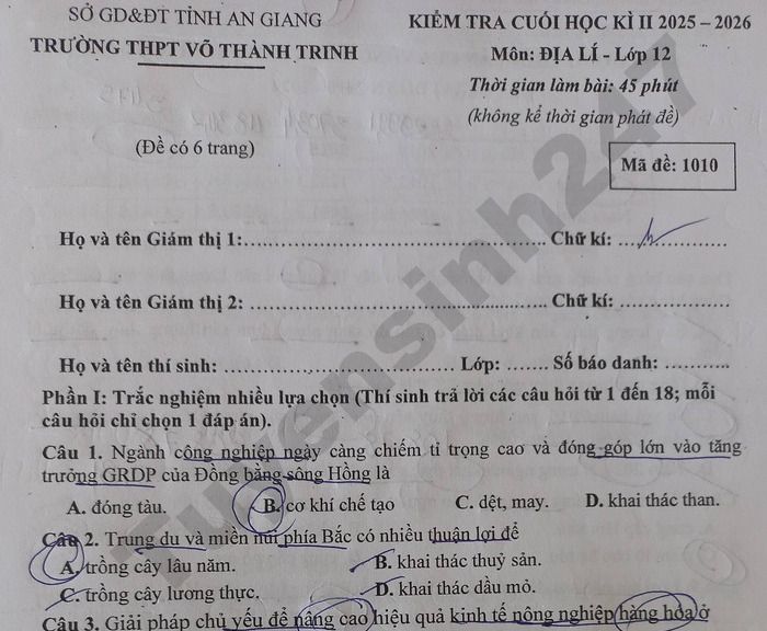 Đề thi cuối kì 2 môn Địa lớp 12 THPT Võ Thành Trinh 2026 Câu 4. Cho thông tin sau: Đồng bằng sông Cửu Long là đồng bằng châu thổ lớn nhất nước ta, địa hình thấp, bằng phẳng, thuận lợi cho canh tác nông nghiệp và các hoạt động kinh tế khác. Vùng có ba loại đất chính: Đất phù sa sông có diện tích khoảng hơn 1 triệu hà, phân bố dọc sông Tiền, sông Hậu, là loại đất tốt, màu mỡ, thích hợp trồng lúa và các loại cây trồng khác. a) Loại đất chiếm diện tích lớn nhất ở Đồng bằng sông Cửu Long là đất mặn. b) Khu vực có diện tích đất mặn lớn trong vùng là Tứ giác Long Xuyên và Đồng Tháp Mười. c) Khai thác cát sông, biến đổi khí hậu, sụt lún bờ sông làm diện tích đất phù sa trong vùng ngày càng thu hẹp. d) Giải pháp để cải tạo đất phèn trong vùng là thủy lợi, bón vôi, trồng cây chịu phèn và sử dụng vật liệu cải tạo đất. Lưu ý: Đáp án trong đề là bài làm của học sinh, có thể không chính xác