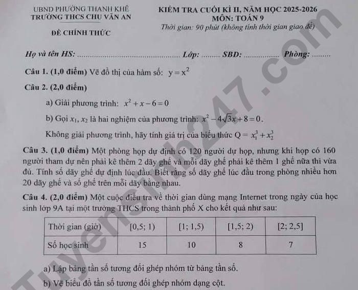 Đề thi cuối kì 2 môn Toán 9 THCS Chu Văn An 2026 Câu 3. (1,0 điểm) Một phòng họp dự định có 120 người dự họp, nhưng khi họp có 160 người tham dự nên phải kê thêm 2 dãy ghế và mỗi dãy ghế phải kê thêm 1 ghế nữa thì vừa đủ. Tính số dãy ghế dự định lúc đầu. Biết rằng số dãy ghế lúc đầu trong phòng nhiều hơn 20 dãy ghế và số ghế trên mỗi dãy bằng nhau.