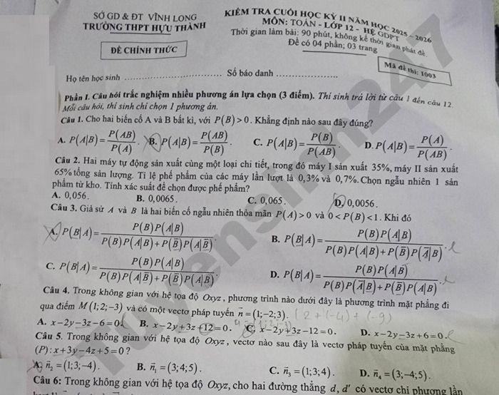 Đề thi cuối kì 2 môn Toán lớp 12 THPT Hựu Thành 2026