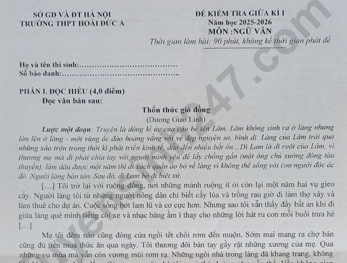 | Đề thi giữa HK1 năm 2025 môn Văn 12 - THPT Hoài Đức A Câu 1. Chỉ ra dấu hiệu để xác định ngôi kể trong đoạn trích trên. Câu 2. Liệt kê các chi tiết cho thấy sự thay đổi của làng quê nơi nhân vật “tôi” sống. Câu 3. Phân tích tác dụng của 01 biện pháp tu từ được sử dụng trong hai câu văn sau: “Tháng năm có thể khiến con người ta tiều tụy đi, yếu mòn đi. Nhưng tháng năm lại khiến ý chí của con người ta can trường và bền bỉ." Câu 4. Cuộc sống ở nhiều vùng nông thôn hiện nay đã và đang thay đổi như vùng quê của nhân vật “tôi”. Anh/chị suy nghĩ như thế nào về vấn đề trên? (trả lời trong khoảng 5-7 dòng).