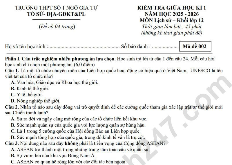 Đề thi giữa học kì 1 lớp 12 môn Toán 2025 - THPT số 1 Ngô Gia Tự Câu 19. Nội dung nào sau đây không phản ánh đúng mục tiêu hoạt động của tổ chức Liên hợp quốc? A. Thúc đẩy quan hệ hữu nghị giữa các dân tộc trên thế giới. B. Trung tâm điều hòa các nỗ lực quốc tế vì mục tiêu chung. C. Giải quyết các tranh chấp quốc tế bằng biện pháp hòa bình. D. Hợp tác quốc tế để giải quyết các vấn đề kinh tế, xã hội.