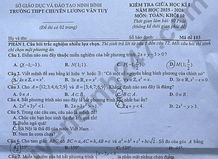 Đề thi giữa học kì 1 Toán lớp 10 THPT Chuyên Lương Văn Tụy 2025 PHẦN III. Trắc nghiệm trả lời ngắn. Thí sinh trả lời từ câu 1 đến câu 2. Câu 1. Một xưởng sản xuất đồ gỗ mỹ nghệ sản xuất ra hai loại sản phẩm I và II. Mỗi bộ sản phẩm loại I lãi 8 triệu đồng, mỗi bộ sản phẩm loại II lãi 10 triệu đồng. Để sản xuất mỗi bộ sản phẩm loại I cần máy làm việc trong 3 giờ và nhân công làm việc trong 1 giờ. Để sản xuất mỗi bộ sản phẩm loại II cần máy làm việc trong 4 giờ và nhân công làm việc trong 2 giờ. Biết rằng chỉ dùng máy hoặc chi dùng nhân công không thể đồng thời làm hai loại sản phẩm cùng lúc, số nhân công luôn ổn định. Một ngày máy làm việc không quá 18 giờ, nhân công làm việc không quá 8 giờ. Hỏi một ngày tiền lãi lớn nhất bằng bao nhiêu? (đơn vị triệu đồng). Lưu ý: Đáp án trong đề là bài làm của học sinh, có thể không chính xác