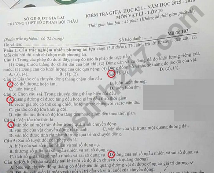 Đề thi giữa kì 1 lớp 10 môn Lý - THPT số 2 Phan Bội Châu 2025 Câu 3: Một máy bay đang bay theo hướng từ Nam đến Bắc với vận tốc 219 m/s thì bị gió thổi theo hướng từ Tây sang Đông với vận tốc 21 m/s. Vận tốc tổng hợp của máy bay này có độ lớn bao nhiêu m/s (làm tròn kết quả đến chỉ số hàng đơn vị)? Câu 4: Một xe ô tô chạy từ A đến B trên một đường thẳng có đồ thị độ dịch chuyển – thời gian được vẽ như hình dưới. Vận tốc của xe bằng bằng bao nhiêu m/s (kết quả làm tròn đến chữ số hàng phần mười)?