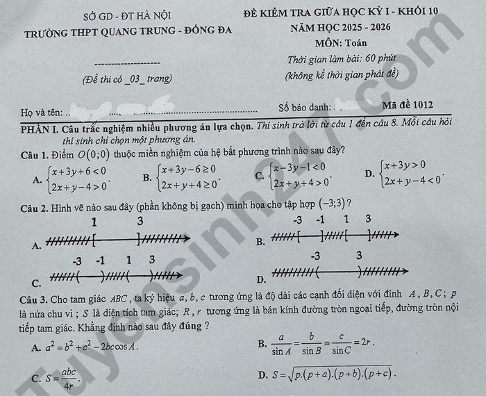 Đề thi giữa kì 1 lớp 10 môn Toán 2025 THPT Quang Trung - Đống Đa PHẦN III. Câu trắc nghiệm trả lời ngắn. Thi sinh trả lời từ câu 1 đến câu 3. Câu 1. Trong đợt văn nghệ chào mừng 55 năm thành lập trường THPT Quang Trung – Đống Đa, lớp 10 4 đăng kí tham gia hai tiết mục là hát tốp ca và nhảy Flashmode. Có 17 học sinh tham gia tiết mục hát tốp ca, 23 học sinh tham gia tiết mục nhảy Flashmode. Biết rằng lớp 10A có 35 học sinh tham gia văn nghệ. Hỏi có bao nhiêu học sinh tham gia cả hai tiết mục văn nghệ?