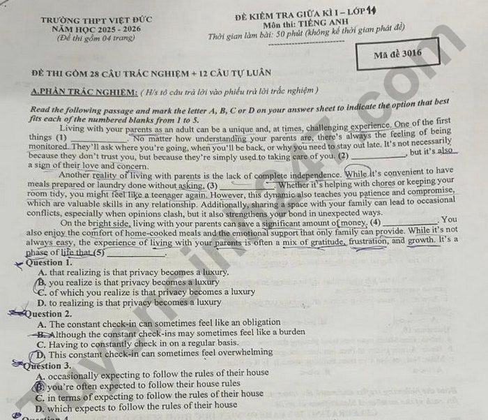Đề thi giữa kì 1 lớp 11 môn Anh 2025 - THPT Việt Đức Question 8. a. Linda: How do you make sure your dog stays healthy and happy? b. Linda: That sounds like a lot of effort. Do you think it's harder to care for a dog compared to other pets? c. Mai: Definitely! Dogs need more attention and interaction, but their loyalty and affection make it worthwhile. d. Linda: I agree. I've always felt dogs build a special bond with their owners that's hard to match. e. Mai: 1 take Max for daily walks, feed him a balanced diet, and schedule regular vet check-ups. Lưu ý: Đáp án khoanh trong đề là bài làm của học sinh, có thể không chính xác