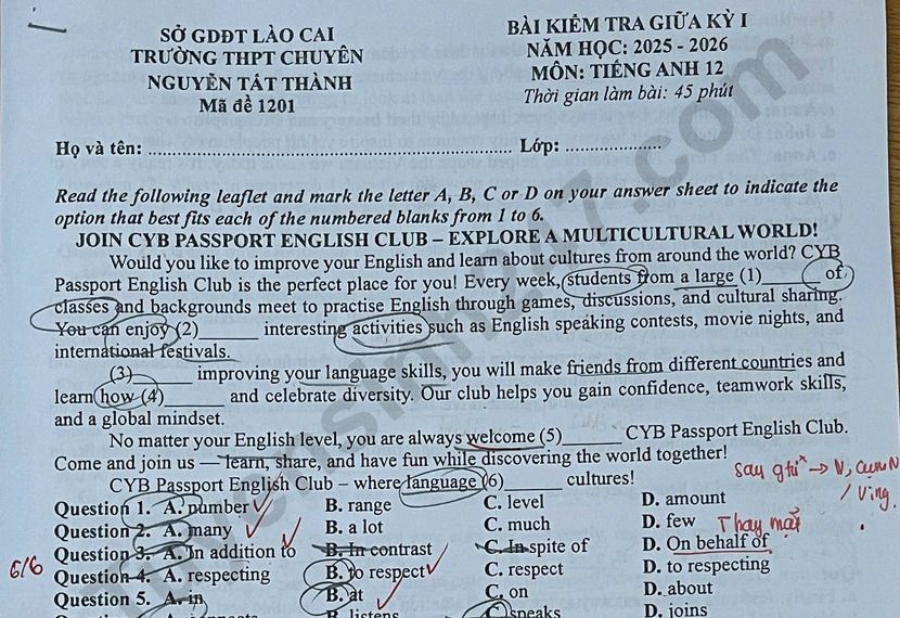Đề thi giữa kì 1 lớp 12 môn Anh 2025 - THPT Chuyên Nguyễn Tất Thành Question 27. Which of the following best paraphrases the underlined sentence in paragraph 3? A. When we compare different cultures, distinct differences in values and social norms become apparent. B. When comparing different cultures, we find that their values and social norms are quite similar. C. Examining cultures reveals that there are often no major differences in their values and norms. D. When we compare different cultures, slight differences in values and social norms become obvious. Question 28. The word appreciate in paragraph 1 is OPPOSITE in meaning to Lưu ý: Đáp án khoanh trong đề thi là của học sinh, có thể không chính xác.