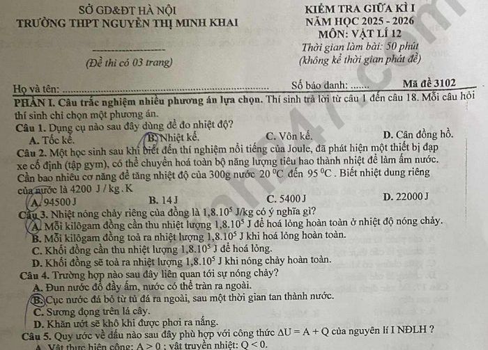 Đề thi giữa kì 1 lớp 12 môn Lý 2025 - THPT Nguyễn Thị Minh Khai Câu 3. Một chậu đựng hỗn hợp nước và nước đá có khối lượng là 10 kg. Chậu để trong phòng và người ta theo dõi nhiệt độ của hỗn hợp. Đồ thị biểu thị sự phụ thuộc nhiệt độ theo thời gian cho ở hình vẽ. Nhiệt dung riêng của nước là c = 4200 J/kg.K và nhiệt nóng chảy riêng của nước là 1 = 3,4.105 J/kg. . (Bỏ qua nhiệt dung của chậu và sự trao đổi nhiệt ra bên ngoài, coi tốc độ nhận nhiệt của hỗn hợp không thay đổi theo thời gian.) a) Trong thời gian 50 phút đầu hỗn hợp ở 0C. Quá trình này nhiệt thu được từ môi trường dùng để làm nóng chảy nước đá. Lưu ý: Đáp án trong đề là bài làm của học sinh, có thể không chính xác