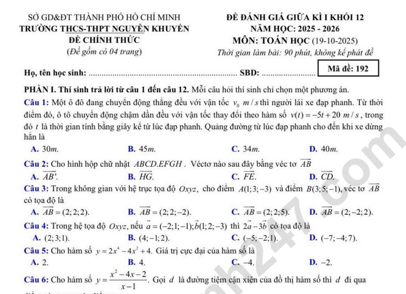 Đề thi giữa kì 1 lớp 12 môn Toán 2025 - THCS&THPT Nguyễn Khuyến Câu 4: Trong không gian Oxyz (đon vị đo lấy theo km), radar phát hiện một chiếc máy bay di chuyển với tốc độ và hướng không đổi từ điểm A(800;500;7) đến điểm B(940; 550;8) trong 10 phút. Nếu máy bay tiếp tục giữ nguyên tốc độ và hướng bay thì tọa độ của máy bay sau 10 phút tiếp theo là D(x;y;z). Khi đó, x- y+z bång bao nhiêu? Theo TTHN 🔥 2K8 CHÚ Ý! LUYỆN THI TN THPT - ĐÁNH GIÁ NĂNG LỰC - ĐÁNH GIÁ TƯ DUY!