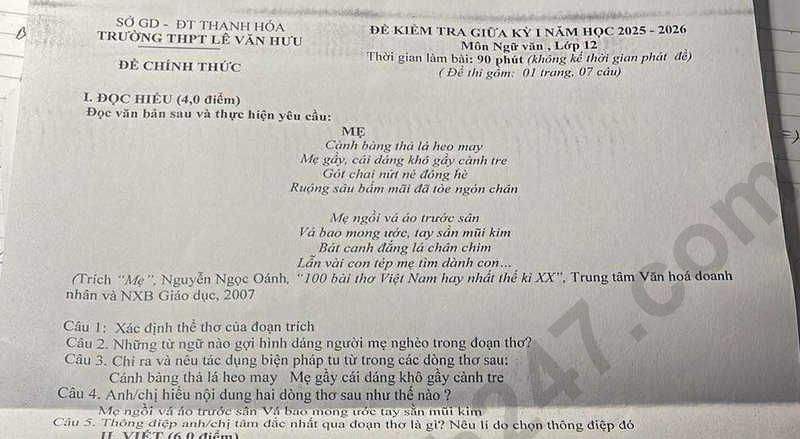 Đề thi giữa kì 1 lớp 12 môn Văn 2025 - THPT Lê Văn Hưu