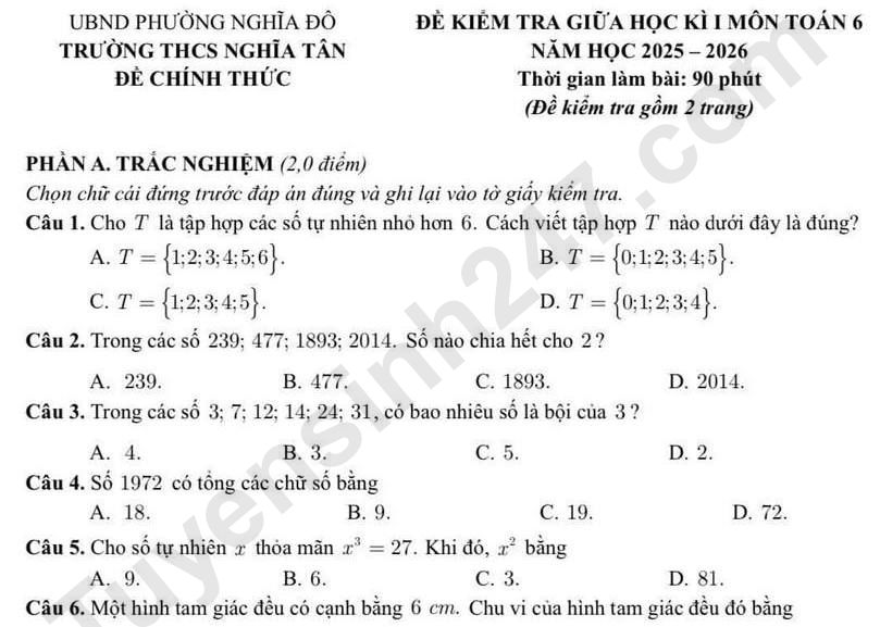 Đáp án đề thi giữa kì 1 lớp 6 môn Toán - THCS Nghĩa Tân 2025