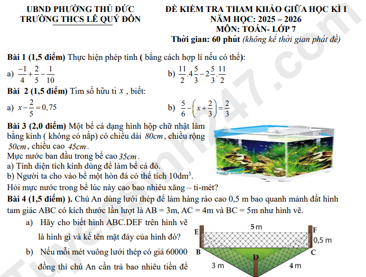 Đề thi giữa kì 1 lớp 7 môn Toán - THCS Lê Quý Đôn 2025 (Tham khảo) Bài 3 (2,0 điểm) Một bể cá dạng hình hộp chữ nhật làm bằng kính (không có nắp) có chiều dài 80cm, chiều rộng 50cm, chiều cao 45cm. Mực nước ban đầu trong bể cao 35cm. a) Tính diện tích kính dùng để làm bể cá đó. b) Người ta cho vào bể một hòn đá có thể tích 10dm. Hỏi mực nước trong bể lúc này cao bao nhiêu xăng – ti-mét? Bài 4 (1,5 điểm) ). Chú An dùng lưới thép để làm hàng rào cao 0,5 m bao quanh mảnh đất hình tam giác ABC có kích thước lần lượt là AB=3m, AC = 4m và BC = 5m như hình vẽ. Theo TTHN NẮM CHẮC KIẾN THỨC, BỨT PHÁ ĐIỂM 9,10 LỚP 1 - LỚP 12 CÙNG TUYENSINH247! Nếu em đang: