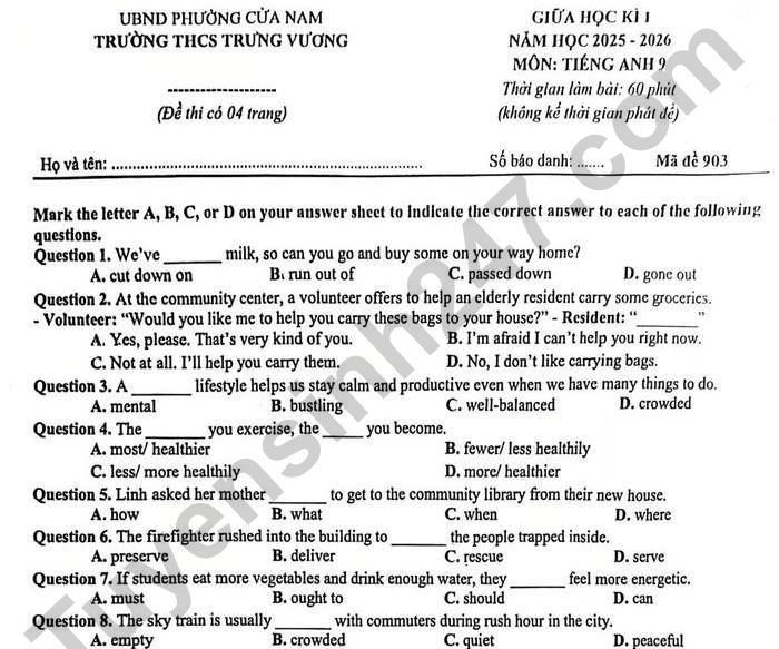 Đề thi giữa kì 1 lớp 9 môn Anh 2025 - THCS Trưng Vương Question 19. In spite/heavy traffic/committee/hold/meeting/ on time. A. In spite of heavy traffic, the committee held the meeting on time. B. In spite heavy traffic, the committee hold the meeting on time. C. In spite the heavy traffic, committee holds the meeting on time. D. In spite of heavy traffic, committee holds the meeting on time. Question 20. Public facility/city/so/modern/resident/enjoy/high/standard/living. A The public facilities in the city are so modern that residents enjoy a high standard of living. B. Public facilities of city are so modern that residents enjoys high standard of living.