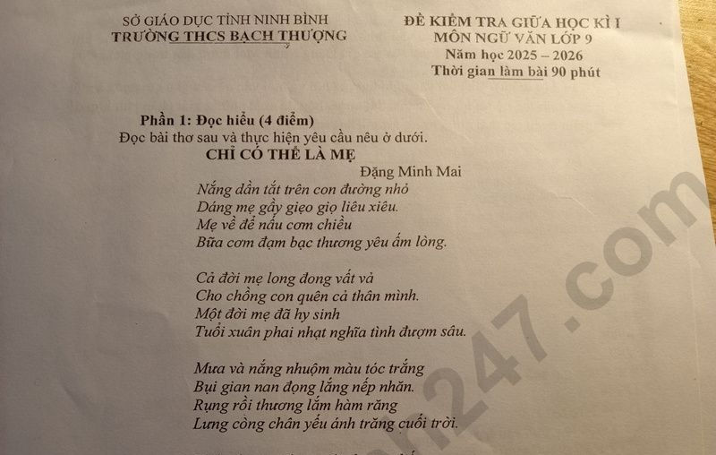 Đề thi giữa kì 1 lớp 9 môn Văn 2025 - THCS Bạch Thượng Câu 3. Em hãy xác định và nêu tác dụng của biện pháp tu từ so sánh được sử dụng trong khổ thơ cuối bài. Câu 4. Bài thơ đã gợi cho ta – những người làm con nhiều thông điệp ý nghĩa. Hãy viết những thông điệp mà em tâm đắc.