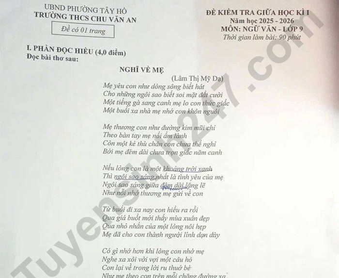 Đề thi giữa kì 1 lớp 9 môn Văn 2025 - THCS Chu Văn An Câu 1 (1,0 điểm). Xác định nhân vật trữ tình và đối tượng trữ tình trong bài thơ. Câu 2 (0,5 điểm). Tìm những hình ảnh thiên nhiên trong khổ thơ thứ ba của bài thơ. Câu 3 (1,5 điểm). Chỉ rõ và nêu tác dụng của biện pháp tu từ so sánh trong những câu thơ sau: Mẹ yêu con như dòng sông biết hát Câu 4 (1,0 điểm). Bài thơ “Nghĩ về mẹ” của tác giả Lâm Thị Mỹ Dạ đã khơi gợi trong lòng mỗi người nhiều cảm xúc. Hãy chia sẻ về một cảm xúc tích cực mà em luôn dành cho những người thân yêu trong gia đình của mình và cho biết vì sao em luôn có cảm xúc đó (viết khoảng 5 – 7 dòng).