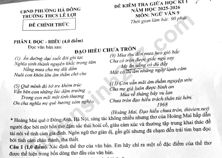 Đề thi giữa kì 1 lớp 9 môn Văn 2025 - THCS Lê Lợi Câu 1 (1,0 điểm). Xác định thể thơ của văn bản. Em hãy chỉ ra một số đặc điểm của thể thơ được thể hiện trong bốn dòng thơ đầu của văn bản. Câu 2 (0,5 điểm). Nêu cảm hứng bao trùm của bài thơ? Câu 3 (1,0 điểm). Nêu hiệu quả nghệ thuật của biện pháp tu từ ẩn dụ được thể hiện trong những dòng thơ sau: “Nắng mưa cha mẹ dãi dầm Nuôi con khôn lớn âm thầm chở che"