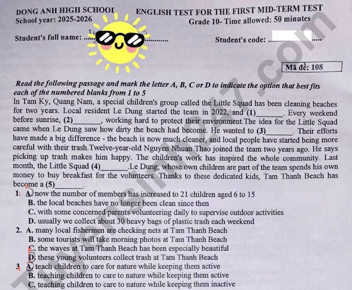Đề thi giữa kì 1 môn Anh lớp 10 - THPT Đông Anh 2025 1. A now the number of members has increased to 21 children aged 6 to 15 B. the local beaches have no longer been clean since then C. with some concerned parents volunteering daily to supervise outdoor activities D. usually we collect about 30 heavy bags of plastic trash each weekend 2. A. many local fishermen are checking nets at Tam Thanh Beach B. some tourists will take morning photos at Tam Thanh Beach C. the waves at Tam Thanh Beach has been especially beautiful D these young volunteers collect trash at Tam Thanh Beach