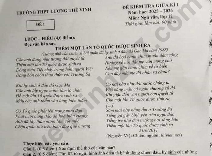 | Đề thi giữa kì 1 môn Văn 12 THPT Lương Thế Vinh 2025 Câu 1. (0.5 điểm) Xác định thể thơ của văn bản. Câu 2. (0.5 điểm) Tìm 02 từ ngữ, hình ảnh diễn tả hành động chiến đấu, hy sinh của những người chiến sĩ hải quân ở đảo đá Gạc Ma được thể hiện trong bài thơ. Câu 3. (1.0 điểm) Phân tích tác dụng của biện pháp tu từ so sánh được thể hiện trong hai