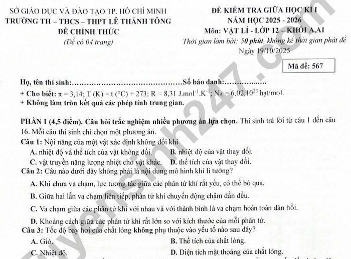 | Đề thi giữa kì 1 năm 2025 lớp 12 môn Lý - TH-THCS-THPT Lê Thánh Tông PHẦN III (1,5 điểm). Câu trắc nghiệm trả lời ngắn. Thí sinh trả lời từ câu 1 đến câu 6. Dùng thông tin sau cho câu 1 và câu 2: Biết nhiệt dung riêng của nước c = 4200 J/(kg.K). Một học sinh thực hành do nhiệt dung riêng của nước với sơ đồ như hình bên. Học sinh chuẩn bị 150g nước có nhiệt độ ban đầu là 62,0 °C. Vôn kế và ampe kế có số chỉ lần lượt là 1,6 V và 2,5 A . Sau khoảng thời gian 9 phút thì nhiệt độ của nước là 65,5 °C. Bỏ qua nhiệt lượng mà bình nhiệt lượng kế và dũa khuấy thu vào. Câu 1: Nhiệt dung riêng của nước trong thí nghiệm này bằng bao nhiêu J(kg.K) (làm tròn kết quả đến chữ số hàng đơn vị)? Câu 2: Sai số tỉ đối khi xác định nhiệt dung riêng trong thí nghiệm của học sinh là bao nhiêu % (làm tròn kết quả đến chữ số hàng đơn vị)?