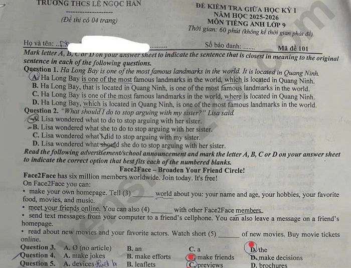 Đề thi giữa kì 1 năm 2025 lớp 9 môn Anh - THCS Lê Ngọc Hân Question 37. Mark the letter A, B, C, or D on your answer sheet to indicate the correct option that best fits each of the numbered blanks A. combines manual skills and natural resources B. in homes or for decorative purposes It is famous for its beautiful nature and a variety of ancient crafts D. They use various natural materials such as willow, palm, straw, and hay Lưu ý: Đáp án trong đề là bài làm của học sinh, có thể không chính xác