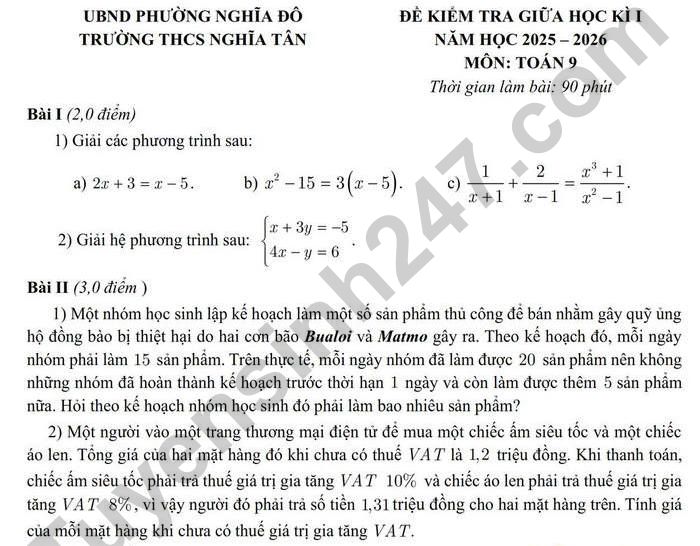 Đề thi giữa kì 1 năm 2025 THCS Nghĩa Tân - môn Toán 9 1) Một nhóm học sinh lập kế hoạch làm một số sản phẩm thủ công để bán nhằm gây quỹ ủng hộ đồng bào bị thiệt hại do hai cơn bão Bualoi và Matmo gây ra. Theo kế hoạch đó, mỗi ngày nhóm phải làm 15 sản phẩm. Trên thực tế, mỗi ngày nhóm đã làm được 20 sản phẩm nên không những nhóm đã hoàn thành kế hoạch trước thời hạn 1 ngày và còn làm được thêm 5 sản phẩm nữa. Hỏi theo kế hoạch nhóm học sinh đó phải làm bao nhiêu sản phẩm?