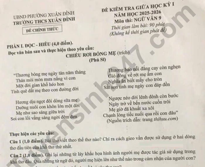 Đề thi giữa kì 1 năm 2025 THCS Xuân Đỉnh - môn Văn 9 Câu 1 (1,0 điểm). Bài thơ viết theo thể thơ nào? Chỉ ra cách gieo vần được sử dụng ở hai dòng thơ đầu tiên của khổ thơ thứ nhất. Câu 2 (1,0 điểm). Ghi lại những từ láy khắc họa hình ảnh người mẹ được tác giả sử dụng trong khổ thơ đầu. Qua những từ ngữ đó, người mẹ hiện lên như thế nào trong cảm nhận của người con? Câu 3 (0,5 điểm). Em hiểu như thế nào về hai câu thơ sau? “Nghĩa ân biết mấy cho tròn