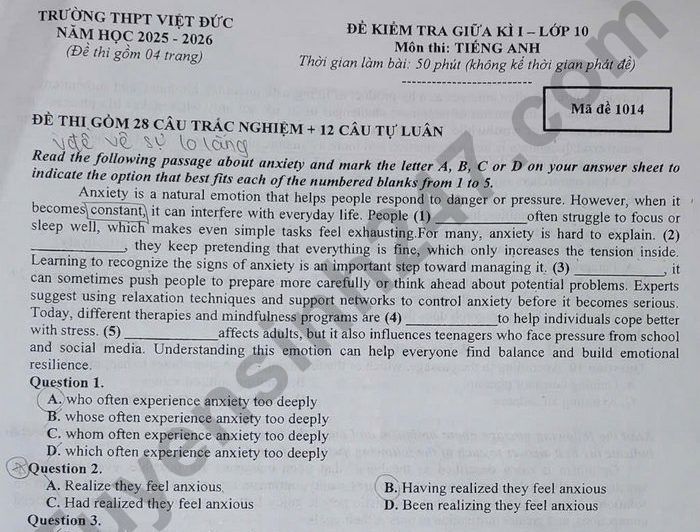 Đề thi giữa kì 1 năm 2025 THPT Việt Đức - môn Anh lớp 10 Question 16. What can be inferred about optimistic people from the passage? A. They usually stay calm and avoid stressful situations. B. They normally choose to escape from uncertainty. C. They often take active steps to solve their problems. D. They tend to succeed in everything they try to do. Lưu ý: Câu trả lời khoanh trong đề là bài làm của học sinh, có thể không xác định được