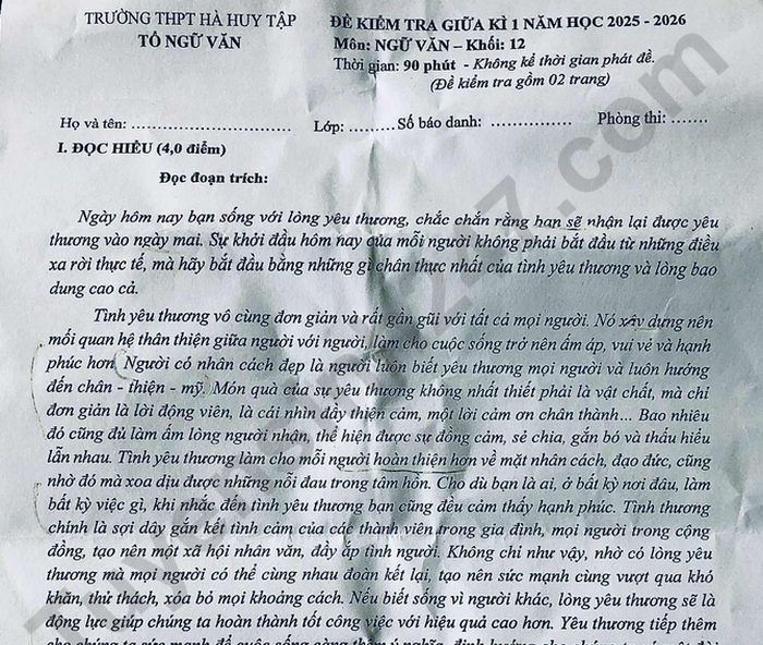 | Đề thi giữa kì 1 năm 2025 Văn lớp 12 - THPT Hà Huy Tập Câu 3. (1.0 điểm) Chỉ ra và nêu tác dụng biện pháp tu từ liệt kê trong câu trích: “Hãy để cho thế giới này luôn được tỏa sáng bằng tình yêu thương và hãy nuôi dưỡng nó bằng cách làm nhiều việc tốt, yêu thương mọi người, sẵn lòng giúp đỡ người khác bằng khả năng có thể.” Câu 4. (1.0 điểm) Anh/ chị hiệu như thế nào về ý kiến “Chính yêu thương đã giúp chúng ta có được niềm tin, nhận ra được lẽ sống, nhìn ra cái đẹp, thấy được những điều tích cực xung quanh mình”?