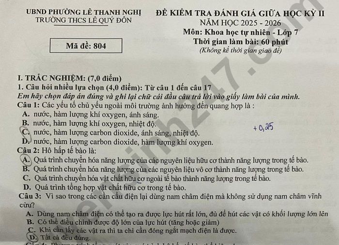 Đề thi giữa kì 2 Khoa học tự nhiên lớp 7 THCS Lê Quý Đôn 2026 Câu 2: Hô hấp tế bào là: A. Quá trình chuyển hóa năng lượng của các nguyên liệu hữu cơ thành năng lượng trong tế bào. B. Quá trình chuyển hóa năng lượng của các nguyên liệu vô cơ thành năng lượng trong tế bào. C. Quá trình chuyển hóa vật chất hữu cơ ngoài tế bào thành năng lượng trong tế bào. D. Quá trình tổng hợp vật chất hữu cơ trong tế bào. Lưu ý: Đáp án trong đề là bài làm của học sinh, có thể không chính xác