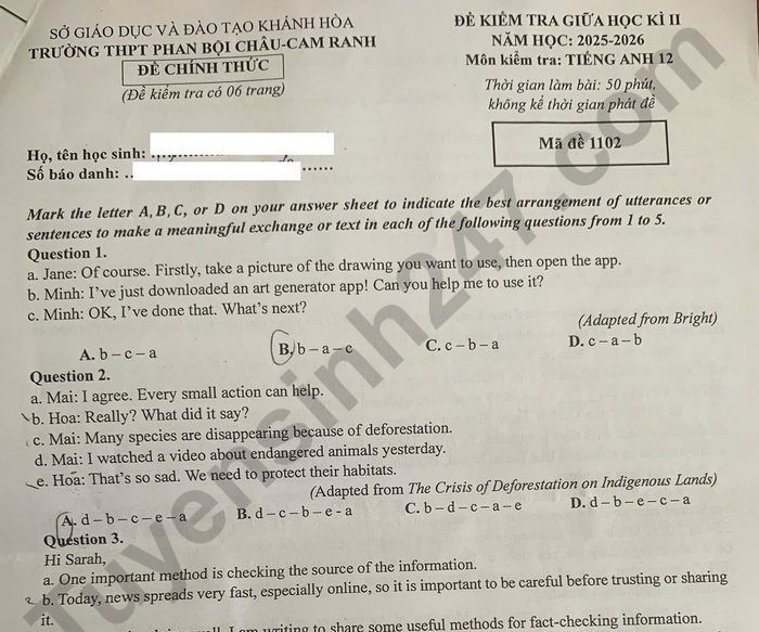 Đề thi giữa kì 2 lớp 12 môn Anh 2026 - THPT Phan Bội Châu-Cam Ranh Read the following passage and mark the letter A, B, C, or D on your answer sheet to indicate the best answer to each of the following questions from 23 to 30. AI (artificial intelligence) has been on the rise since the 1990s, but people started to notice its power when humanoid robots were first introduced in 2016. Since then, the potential of AI has been extremely promising, but it has raised significant concerns about the control over Al abilities. Phone scams involved in Al-generated voice have been reported in the USA and some European nations. Scammers, equipped with advanced knowledge and skills, collected some data and recorded some victim's voices before they faked the victims' voices to borrow some money from their friends and relatives. In these situations, some parents received a phone call from an unknown number and heard their child's voice crying, "I've been kidnapped. Help me!" while the child was actually safe at school or a friend's house. Consequently, the parents were terrified and transferred large sums of money to the scammers.