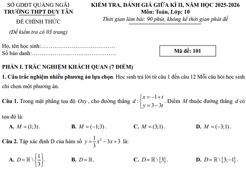 Đáp án Đề thi giữa kì 2 Toán 10 trường THPT Duy Tân năm 2026