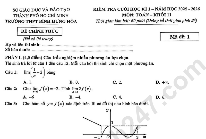 Đề thi HK 1 lớp 11 môn Toán 2025 - THPT Bình Hưng Hòa Câu 10: Một chiếc bình nước hình trụ được đặt trên bàn, lượng nước trong bình bằng đúng một phần ba dung tích của bình. An đặt một chiếc ống hút dài 21 cm vào trong bình. Khi đó một đầu của ống hút chạm vào đáy bình, đầu còn lại chạm vào miệng bình. Hỏi độ đài của phần ống hút bị ướt bằng bằng bao nhiêu? A. 10,5 cm B. 21 cm. C. 14cm. D. 7 cm.