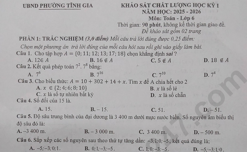 Đề thi HK 1 lớp 6 môn Toán 2025 - Phường Tĩnh Gia