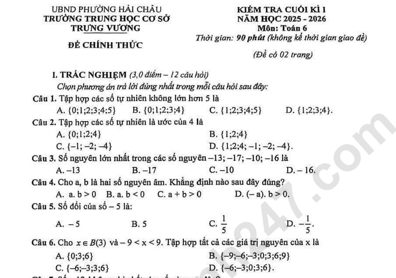 Đề thi HK 1 lớp 6 môn Toán 2025 - THCS Trưng Vương
