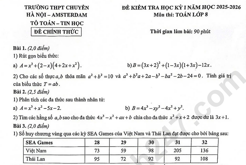 Đề thi HK 1 lớp 8 môn Toán 2025 - THPT Chuyên Amsterdam