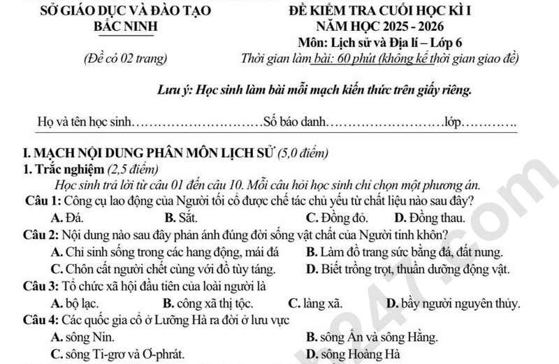 Đề thi HK1 lớp 6 môn Lịch sử và Địa lý 2025 - Sở GD Bắc Ninh