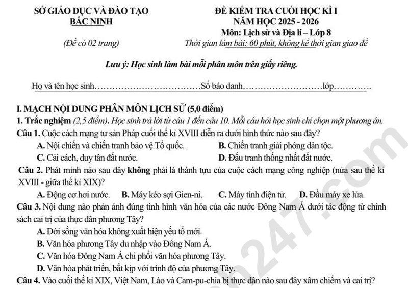 Đáp án đề thi HK1 lớp 8 môn Lịch sử và Địa lý 2025 - Sở GD Bắc Ninh