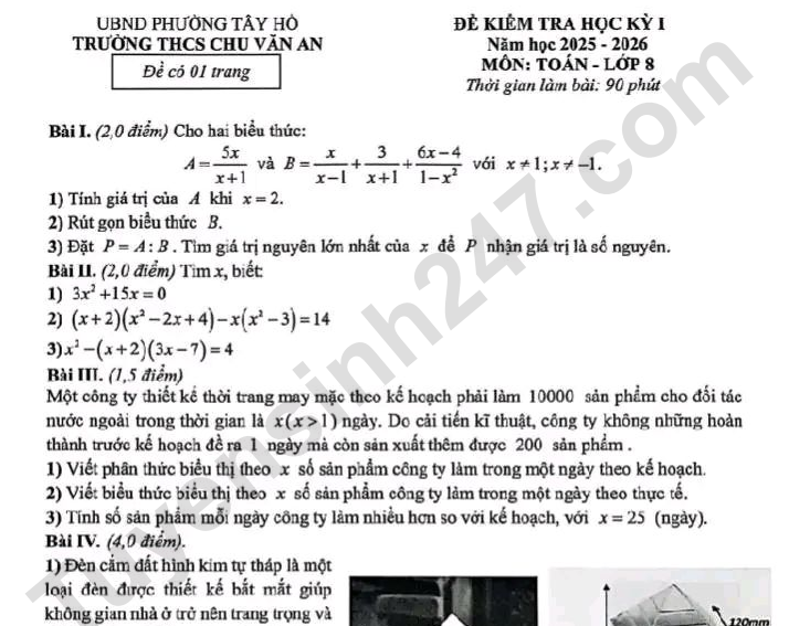 Đáp án Đề thi HK1 lớp 8 môn Toán 2025 - THCS Chu Văn An