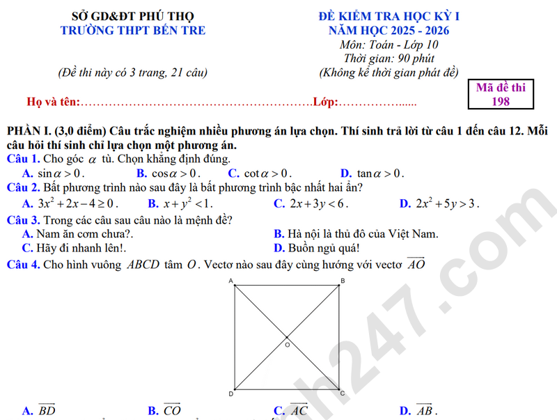 Đề thi HK1 môn Toán lớp 10 năm 2025 - THPT Bến Tre