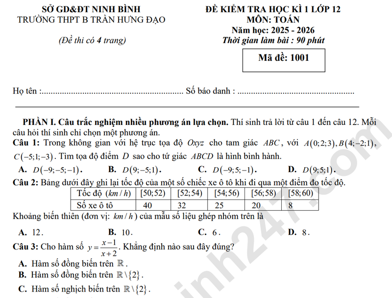 Đề thi HK1 môn Toán lớp 12 năm 2025 - THPT B Trần Hưng Đạo