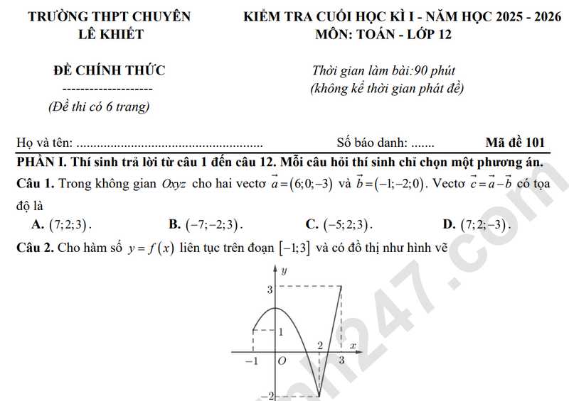 Đề thi HK1 môn Toán lớp 12 năm 2025 - THPT Chuyên Lê Khiết