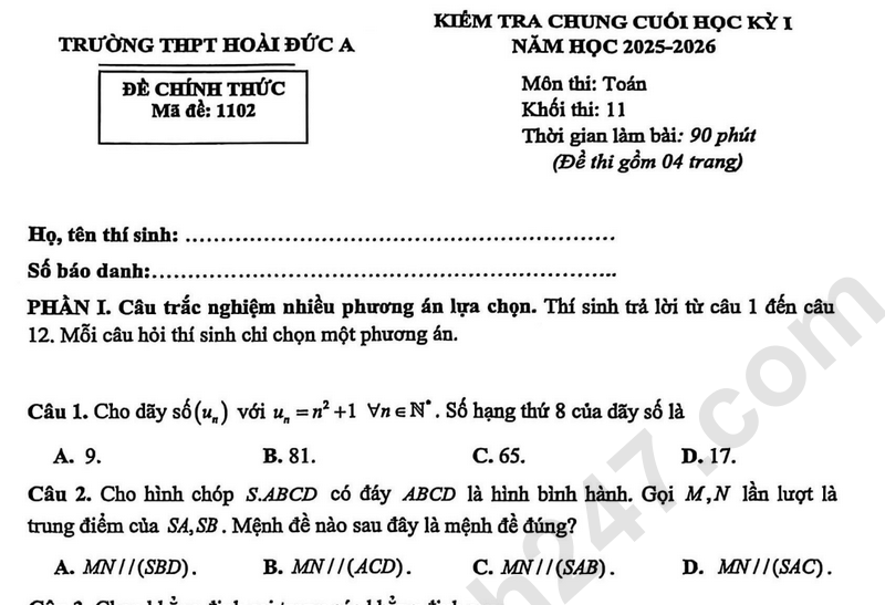 Đề thi HK1 năm 2025 môn Toán lớp 12 - THPT Hoài Đức A