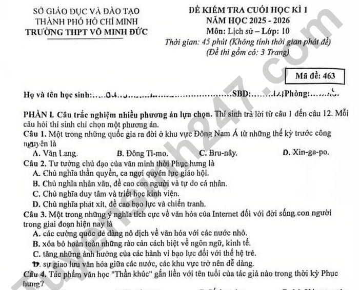 Đề thi học kì 1 lớp 10 môn Sử - THPT Võ Minh Đức 2025 Câu 3. Một trong những ý nghĩa tích cực về văn hóa của Internet đối với đời sống con người trong giai đoạn hiện nay là A. các cường quốc dễ dàng nô dịch về văn hóa với các nước nhỏ. B. xóa bỏ hoàn toàn những rào cản cách biệt về ngôn ngữ, kinh tế. C. tăng những ảnh hưởng của các hành vi bạo lực đối với thế hệ trẻ. D. Sự giao lưu văn hóa giữa các nước, các khu vực trở nên dễ dàng.