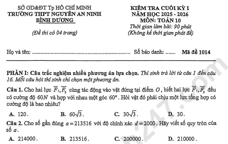 Đề thi học kì 1 lớp 10 môn Toán năm 2025 - THPT Nguyễn An Ninh