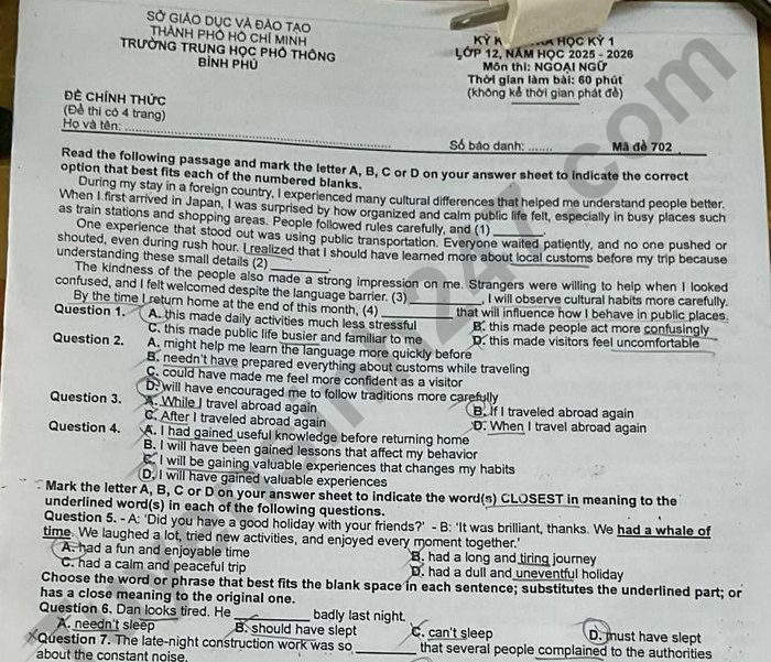 Đề thi học kì 1 lớp 12 môn Anh 2025 - THPT Bình Phú